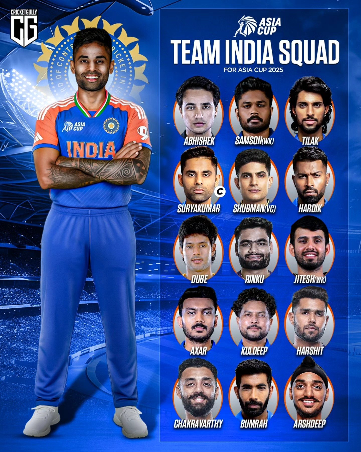 Suryakumar Yadav (c), Shubman Gill (vc), Abhishek Sharma, Tilak Varma, Nitish Kumar Reddy, Shivam Dube, Axar Patel, Jitesh Sharma (wk), Varun Chakaravarthy, Jasprit Bumrah, Arshdeep Singh, Kuldeep Yadav, Harshit Rana, Sanju Samson (wk), Rinku Singh, Washington Sundar